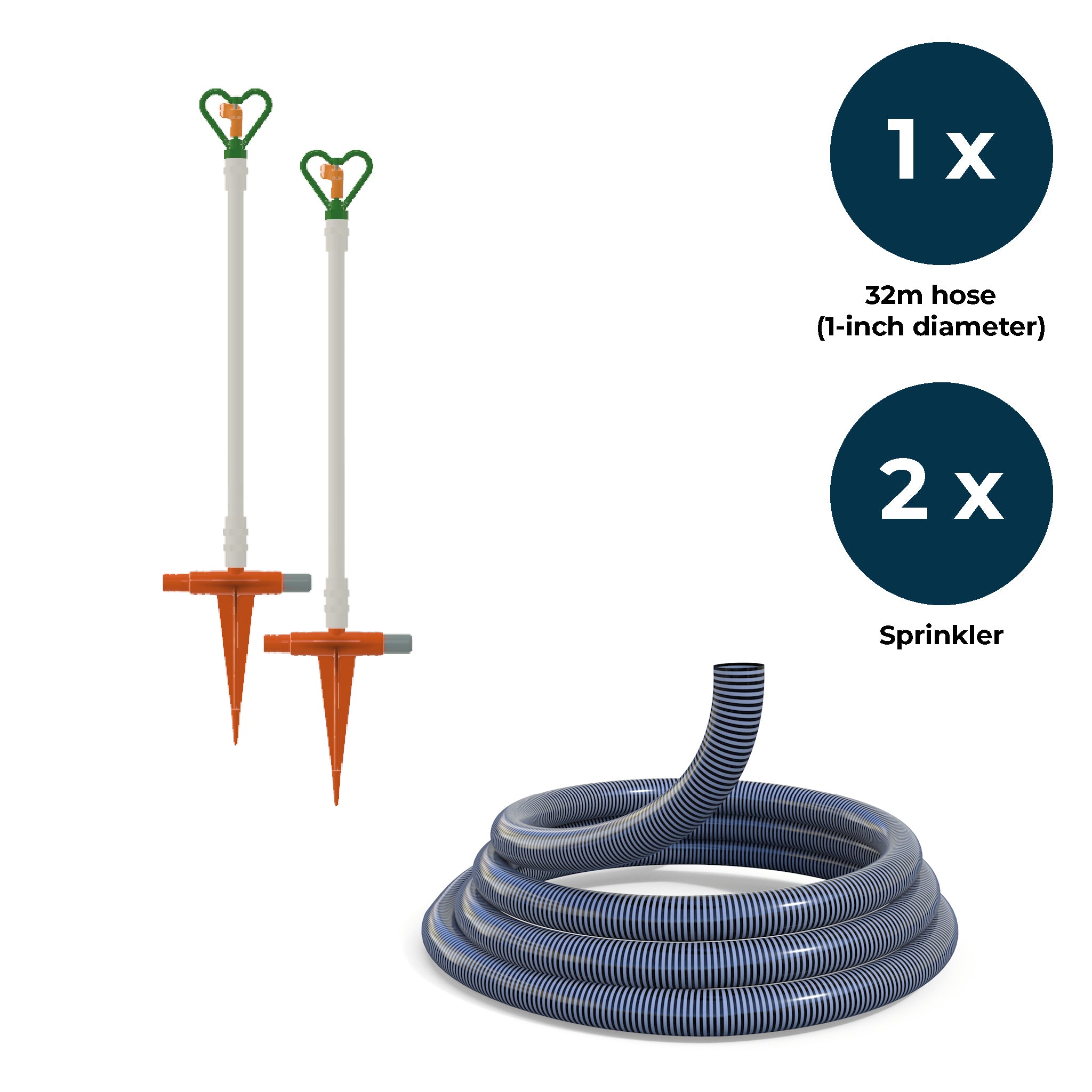 The SF2H Sprinkler Pack consists of sprinklers (2 or 4) and a 30m length of 32mm (1.25-inch) hose.